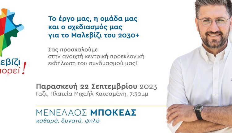 Το έργο, η ομάδα και ο σχεδιασμός της παράταξης “Το Μαλεβίζι μπορεί” του Δημάρχου και εκ νέου υποψηφίου Μενέλαου Μποκέα παρουσιάζονται σήμερα στις 7.30 το απόγευμα, στην πλατεία Μιχάλη Κατσαμάνη στο Γάζι (έμπροσθεν του Δημαρχείου Μαλεβιζίου).