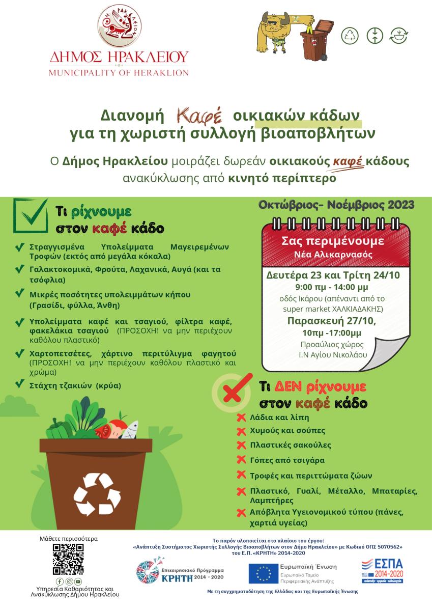 Ο Δήμος Ηρακλείου/Αντιδημαρχία Περιβάλλοντος και Κυκλικής Οικονομίας, στο πλαίσιο της εκστρατείας ενημέρωσης που υλοποιεί για το καίριο αλλά και δύσκολο βήμα της συλλογής των υπολειμμάτων από τις κουζίνες σπιτιών και επιχειρήσεων,συνεχίζει την δωρεάν διανομή οικιακών καφέ κάδων 10ltlt σε δημότες.