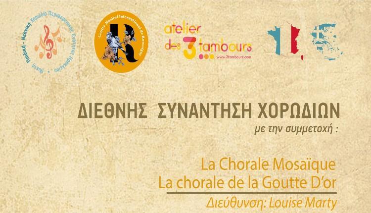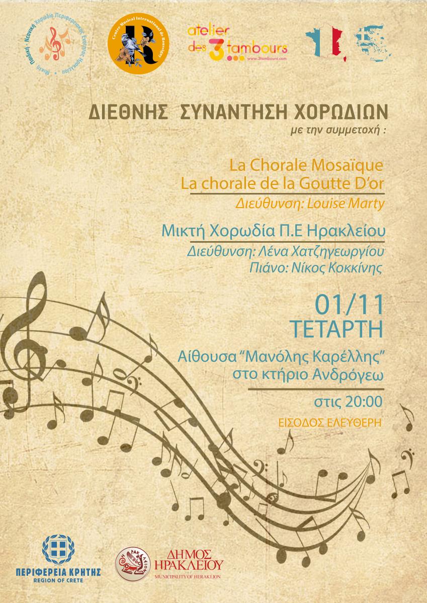 Με τη συνδιοργάνωση της Περιφέρειας Κρήτης και με την υποστήριξη του Δήμου Ηρακλείου, ο Σύλλογος Μικτής Παιδικής και Νεανικής Χορωδίας της Περιφερειακής Ενότητας Ηρακλείου, διοργανώνει διεθνή συνάντηση χορωδιών με την συμμετοχή των Χορωδιών LaChorale de laGoutteD’or και LaChoraleMosaïque, από την Γαλλία υπό την διεύθυνση της LouiseMarty και την Μικτή Χορωδία της Περιφερειακής Ενότητας Ηρακλείου υπό την διεύθυνση της Λένας Χατζηγεωργίου.