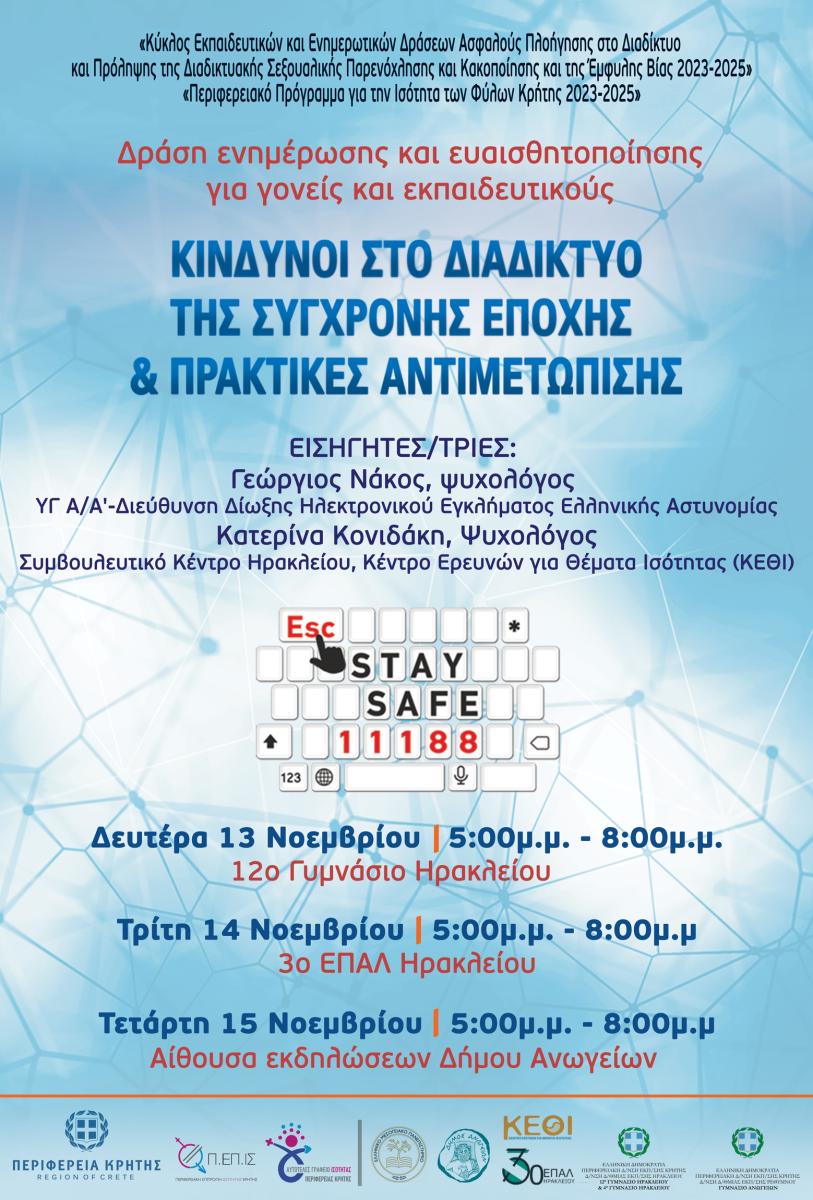 Η Περιφέρεια Κρήτης, Αυτοτελές Γραφείο Ισότητας και Περιφερειακή Επιτροπή Ισότητας των Φύλων Κρήτης (Π.ΕΠ.Ι.Σ.), σε συνεργασία με τη Διεύθυνση Δίωξης Ηλεκτρονικού Εγκλήματος της Ελληνικής Αστυνομικής πρόκειται να υλοποιήσουν δράσεις ενημέρωσης και ευαισθητοποίησης για μαθήτριες/-τές, εκπαιδευτικούς και γονείς, με θέμα: «Κίνδυνοι στο διαδίκτυο της σύγχρονης εποχής και πρακτικές αντιμετώπισης». Στόχος των παραπάνω δράσεων είναι η προστασία παιδιών και εφήβων κοριτσιών και αγοριών από τις παραβιαστικές συμπεριφορές στον ψηφιακό κόσμο, τη διαδικτυακή παραπλάνηση και παρακολούθηση, τη χωρίς συναίνεση διαμοίραση προσωπικών στιγμών και το σεξουαλικό διαδικτυακό εξαναγκασμό και η εκπαίδευση τους στην ασφαλή χρήση του διαδικτύου.
