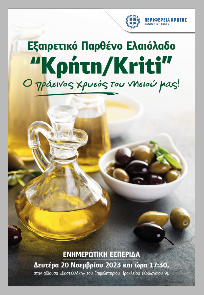 Η Περιφέρεια Κρήτης διοργανώνει στο πλαίσιο της Παγκόσμιας Ημέρας Ελιάς ενημερωτική εσπερίδα αφιερωμένη στο εξαιρετικό παρθένο ελαιόλαδο «Κρήτη/Kriti» με θέμα «Εξαιρετικό Παρθένο Ελαιόλαδο «Κρήτη/Kriti», ο πράσινος χρυσός του νησιού μας» τη Δευτέρα 20 Νοεμβρίου 2023 και ώρα 17:30, στην αίθουσα «Καστελλάκη» του Επιμελητηρίου Ηρακλείου (Κορωναίου αρ. 9).