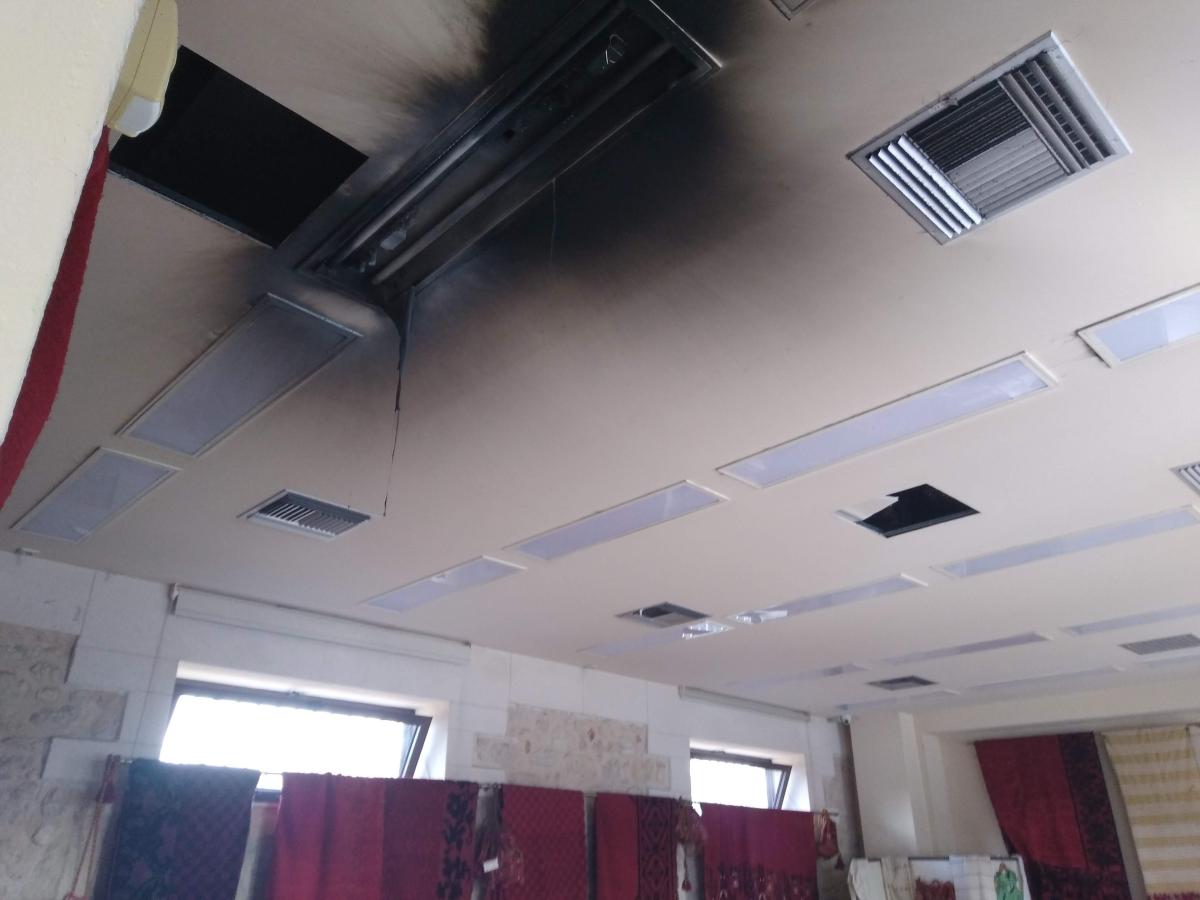 Για καλή τύχη όλων, οι πόρτες σήμερα ήταν κλειστές και αυτός είναι ένας λόγος που δεν εξαπλώθηκε σήμερα Κυριακή η φωτιά που ξέσπασε μέσα στον χώρο των υφαντών εξαιτίας βραχυκυκλώματος στη λάμπα της οροφής.