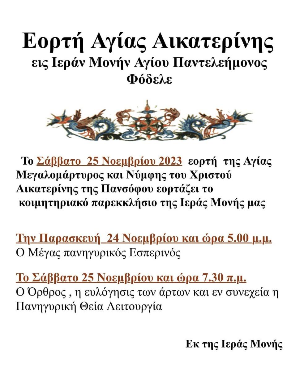 Εορτάζει το Σάββατο το Κοιμητηριακό Παρεκκλήσιο της Αγίας Αικατερίνης στις εγκαταστάσεις της Μονής του Αγίου Παντελεήμονος στο Φόδελε.
