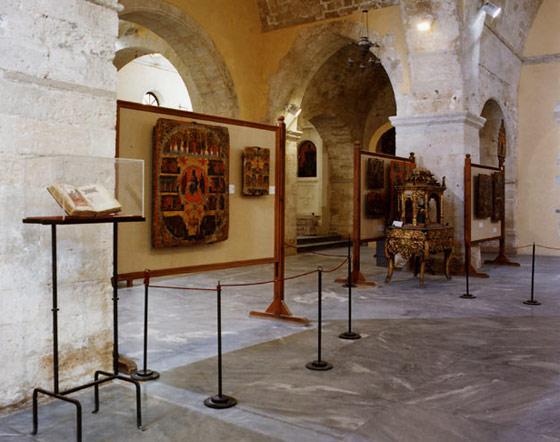 Κύριο θέμα της έκθεσης του Μουσείου είναι η εκκλησιαστική τέχνη που αναπτύχθηκε στην Κρήτη από τον 14ο μέχρι τον 19ο αιώνα, με ιδιαίτερη έμφαση στις μεταβυζαντινές εικόνες, κυρίως σε αντιπροσωπευτικά έργα της Κρητικής Σχολής Αγιογραφίας. Ανάμεσα στα πιο σημαντικά εκθέματα συγκαταλέγονται εικόνες δύο σπουδαίων εκπροσώπων αυτής της σχολής, του Άγγελου Ακοτάντου (αρχές 15ου αι.) και του Μιχαήλ Δαμασκηνού (16ος αι.). Η έκθεση περιλαμβάνει επίσης δείγματα τοιχογραφιών, λιθογλυπτικής, ξυλογλυπτικής, μεταβυζαντινής μεταλλοτεχνίας και μικροτεχνίας, νομισμάτων, λατρευτικών αντικειμένων, αμφίων, κεντητικής, χειρογράφων και παλαιτύπων.