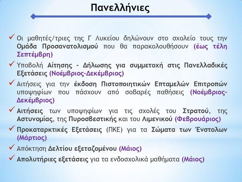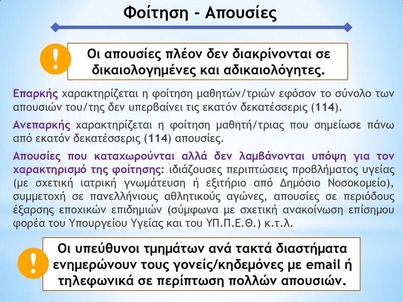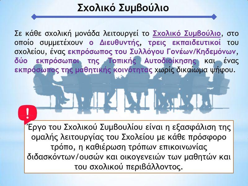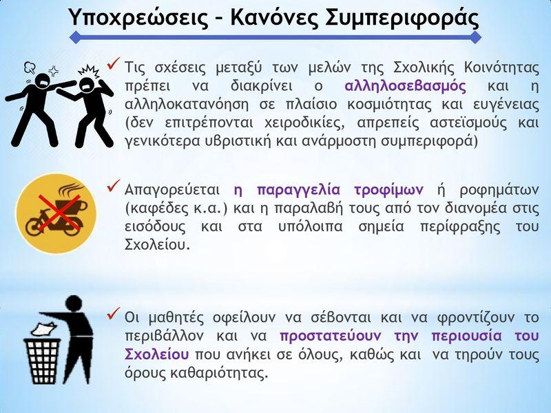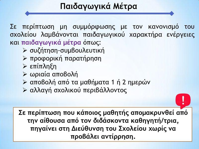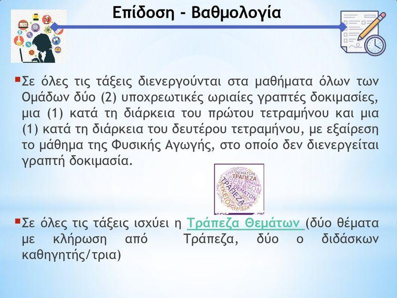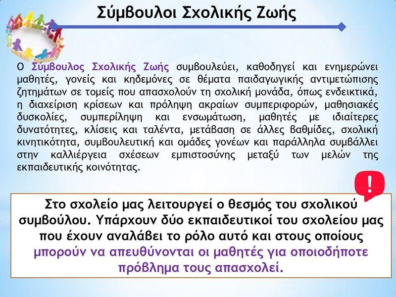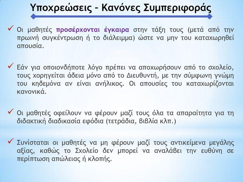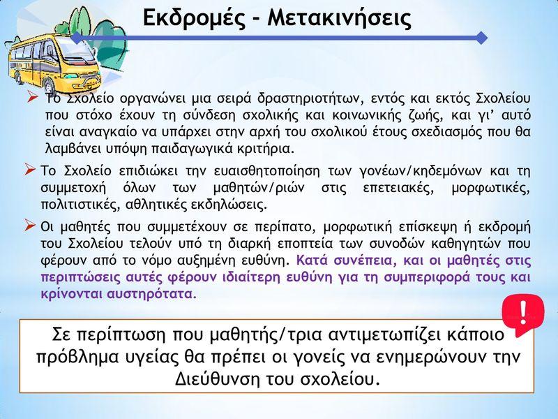 Κατά τη διάρκεια της συνάντησης έγινε παρουσίαση όλων των παραμέτρων που αφορούν στο σχολείο όπως η επικοινωνία των γονέων με το σχολεία, το ωράριο και οι κανόνες λειτουργίας, ο σύλλογος γονέων, το Σχολικό Συμβούλιο, τα παιδαγωγικά μέτρα, η φοίτηση, οι απουσίες, οι επιδόσεις, οι εξετάσεις, οι εκδρομές, ο επαγγελματικός προσανατολισμός και άλλα.