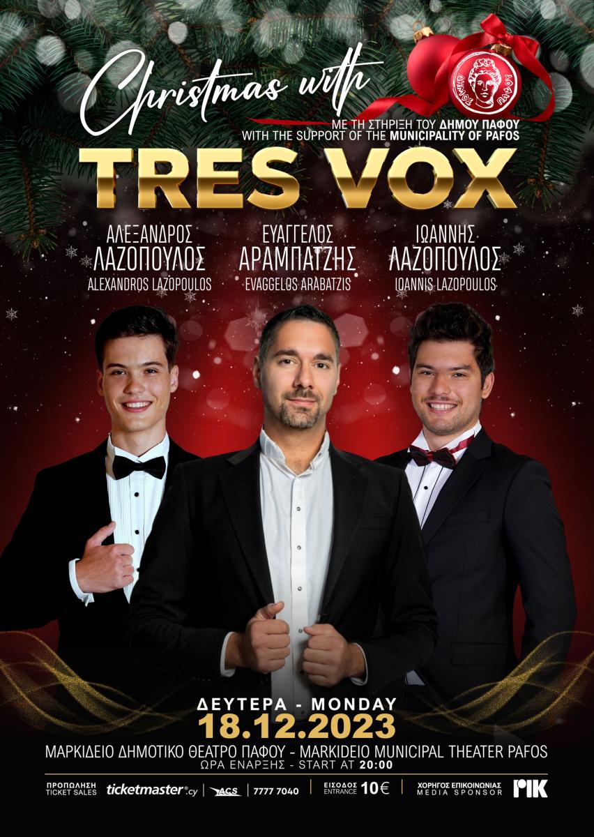 Οι Ευάγγελος Αραμπατζής, Ιωάννης Λαζόπουλος και Αλέξανδρος Λαζόπουλος ετοιμάζονται να χαρίσουν στο κοινό μια μαγική βραδιά γεμάτη μουσική και συναισθηματική επαφή. Μη χάσετε αυτήν την εξαιρετική ευκαιρία να απολαύσετε ένα μοναδικό μουσικό ταξίδι με τους Tres Vox