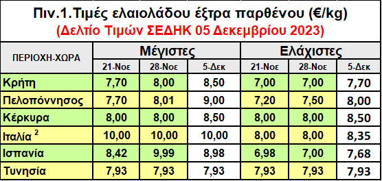 -Στην Κρήτη, κυμάνθηκαν μεταξύ 7,70-8,50€/κ, στην Πελοπόννησο από 8,00-9,00 €/κ και στη Κέρκυρα στα 8,5 €/κ