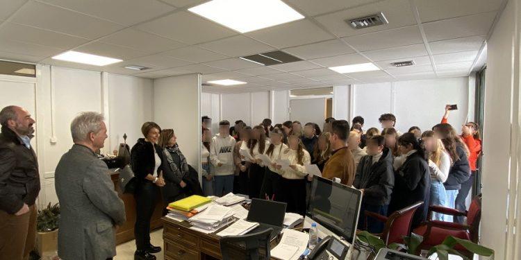 Με εορταστικές μελωδίες και τραγούδια γέμισε το γραφείο του Δημάρχου Ηρακλείου Αλέξη Καλοκαιρινού το μεσημέρι της Δευτέρας 15/1/2024 από τις μαθήτριες και τους μαθητές της χορωδίας του 4ου ΓΕΛ Ηρακλείου.