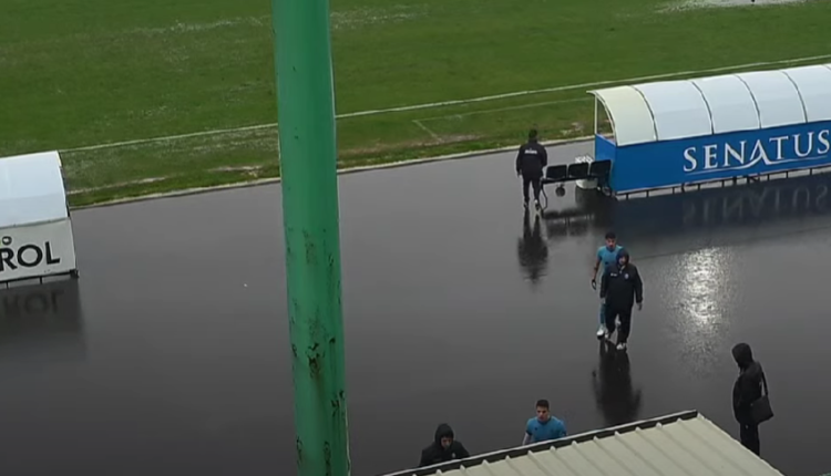 Ο φυσικός χλοοτάπητας στο ΔΑΚ Γάλλου “Π. Βαρδινογιάννης” γέμισε με αρκετές λιμνούλες που ως αποτέλεσμα είχε, να μην γίνει δυνατή η συνέχεια διεξαγωγής του αγώνα λίγο μετά το 10ο λεπτό.