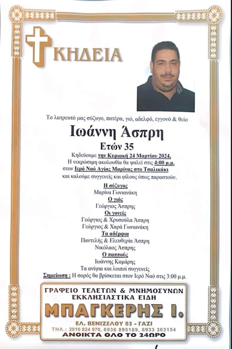 Ο Γιάννης Άσπρης, ένας άνθρωπος γνωστός και αγαπητός, στο Τσαλικάκι που κατοικούσε αλλά και σε ολόκληρο το Μαλεβίζι πέθανε ξαφνικά αφήνοντας πίσω του τον μόλις 3 ετών γιο του, τη σύζυγο του αλλά και την ολόκληρη την οικογένεια του.