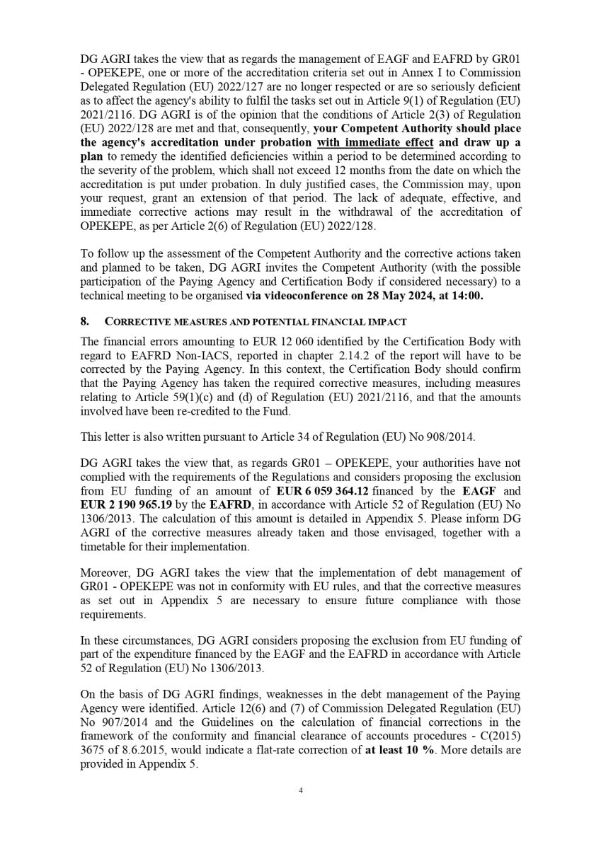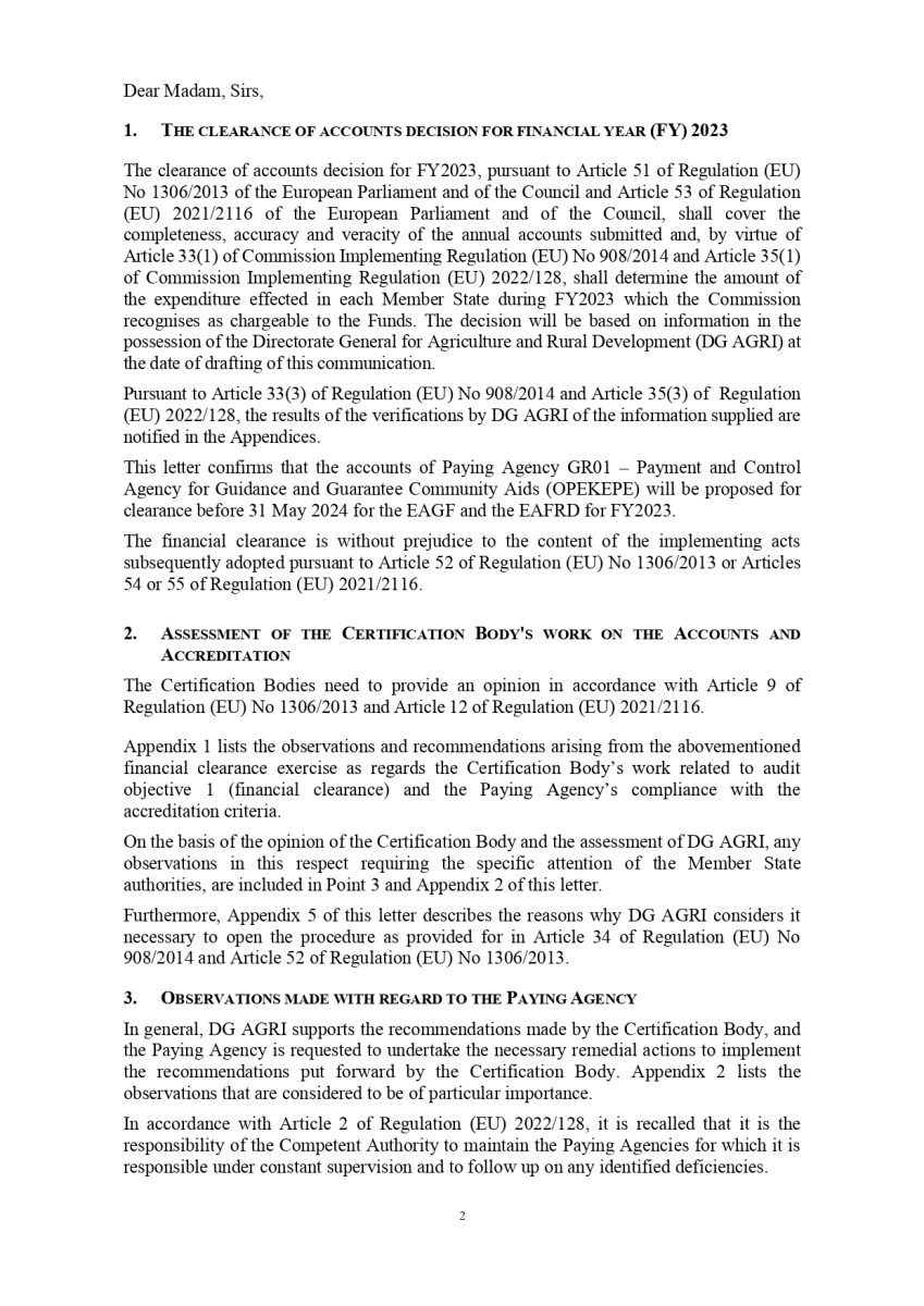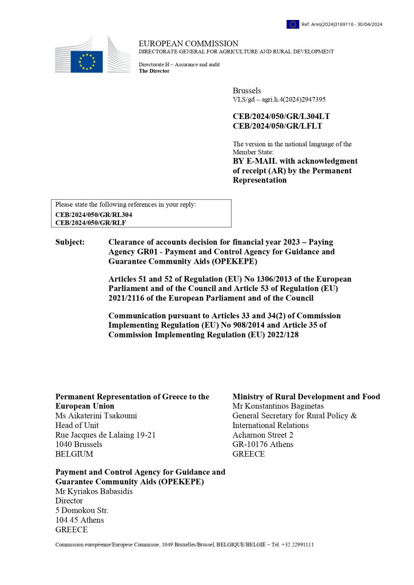 Δείτε εδώ την επιστολή DG AGRI προς τη διοίκηση του ΟΠΕΚΕΠΕ