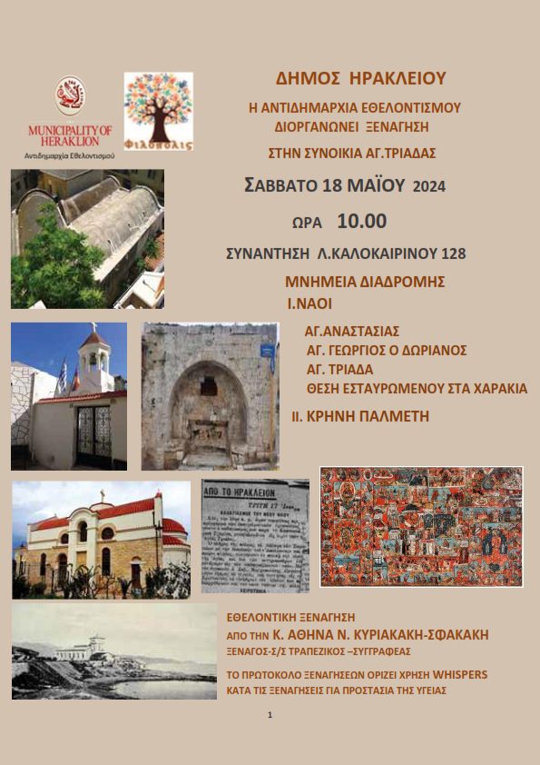 Η διαδρομή που θα ακολουθήσει η ξεναγός Αθηνά Σφακάκη μαζί με τους συμμετέχοντες, θα επικεντρωθεί στην συνοικία της Αγίας Τριάδας. Θα ξεκινήσει από την Λ. Καλοκαιρινού 128, θα περάσει από τους Ιερούς Ναούς της Αγίας Αναστασίας, του Αγίου Γεωργίου Δωριανού, της Αγίας Τριάδος, της Θέσης Εσταυρωμένου στα Χαράκια και θα καταλήξει στην Κρήνη Παλμέτη.