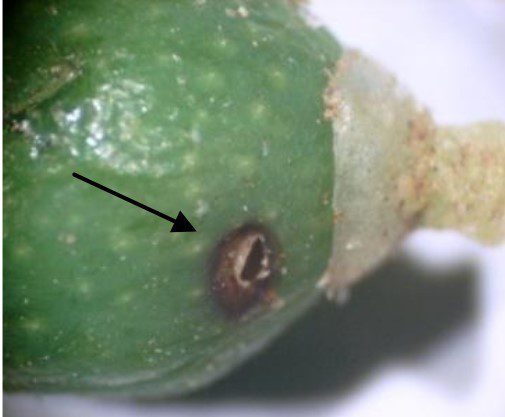 Στους προσβεβλημένους καρπούς που δεν πέφτουν πρόωρα οι προνύμφες τρέφονται μέσα στον πυρήνα. Συνήθως στα τέλη του καλοκαιριού οι ώριμες προνύμφες ανοίγουν στοά εξόδου τραυματίζοντας τον ποδίσκο και τότε προκαλείται όψιμη καρπόπτωση. Οι προσβεβλημένοι καρποί ξηραίνονται, μαυρίζουν και πέφτουν.