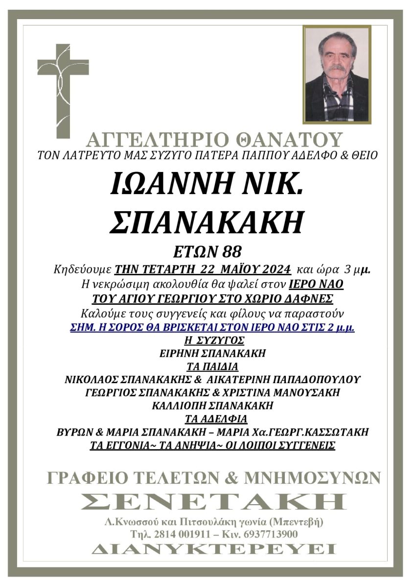 Θλίψη έφερε στην οικογένεια του, σε συγγενείς, φίλους και γνωστούς ο θάνατος του Ιωάννη Σπανακάκη που έφυγε από τη ζωή στα 88 του χρόνια.