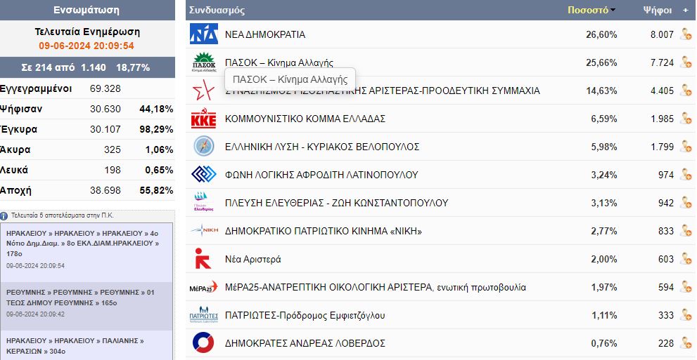 Σε 124 από 1.140 εκλογικά τμήματα (18,77%), τα αποτελέσματα δείχνουν πως το κυβερνών κόμμα προηγείται σε ψήφους ωστόσο το ΠΑΣΟΚ ακολουθεί δυναμικά επικρατώντας στα εκλογικά τμήματα στους νομούς Ηρακλείου και Λασιθίου.