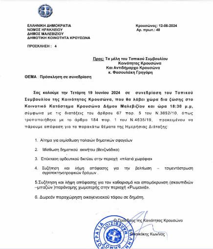 Συνεδριάζει το απόγευμα της Τετάρτης 19 Ιουνίου στις 18:30 το τοπικό συμβούλιο της κοινότητας Κρουσώνα στο κοινοτικό κατάστημα του δήμου Μαλεβιζίου.