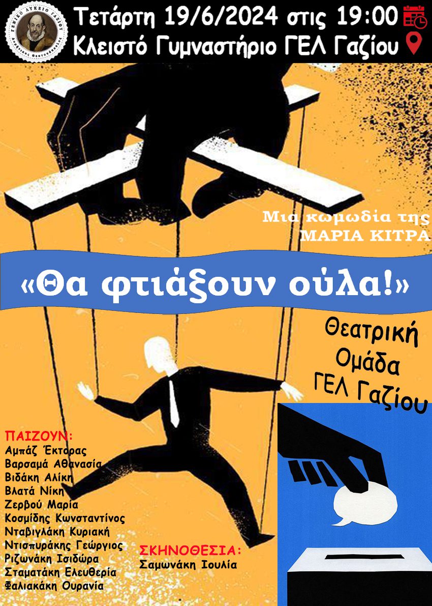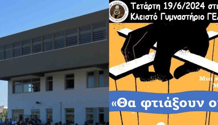 Η εκδήλωση λήξης του σχολικού έτους που οργανώνουν από κοινού ο Σύλλογος Διδασκόντων αλλά και ο Σύλλογος Γονέων και Κηδεμόνων του ΓΕΛ Γαζίου θα γίνει στην αίθουσα του κλειστού Γυμναστηρίου του ΓΕΛ στις 6:45 το απόγευμα και περιλαμβάνει στο πρόγραμμα της: