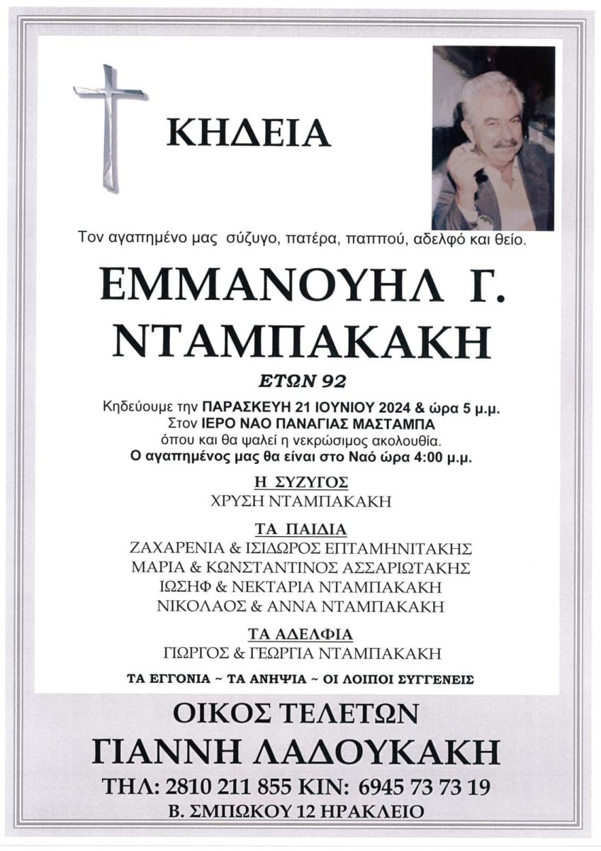 Στο πένθος βύθισε την οικογένεια του Εμμανουήλ Γ. Νταμπακάκη που έφυγε από τη ζωή στα 92 του χρόνια.