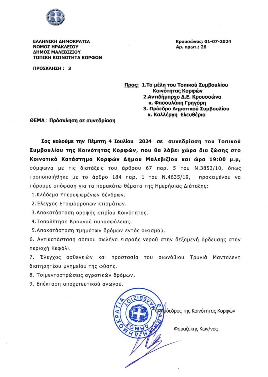 Συνεδριάζει την Πέμπτη το απόγευμα στις 7.00 μ.μ το Δ.Σ της τοπικής κοινότητας Κορφών με σημαντικά θέματα, μετά από έγγραφη πρόσκληση του Προέδρου Κώστα Φαραζάκη.