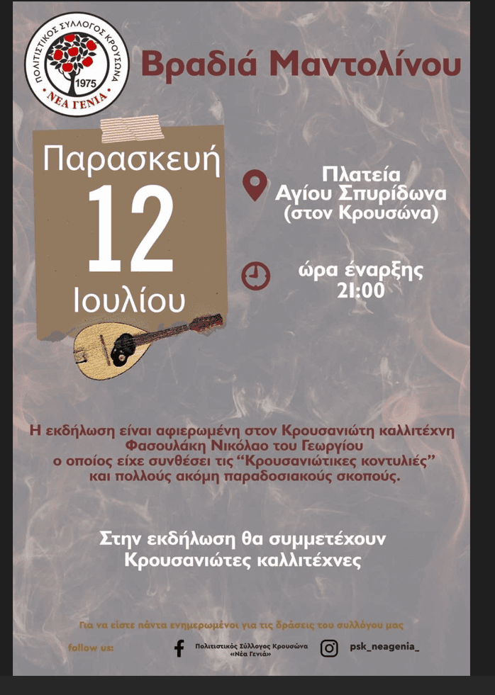 Στις 21:00 ο Πολιτιστικός Σύλλογος «Νέα Γενιά» και όλοι οι Κρουσανιώτες στο μεγάλο κεφαλοχώρι του Μαλεβιζίου, δίνουν ραντεβού στην Πλατεία του Αγίου Σπυρίδωνα, για μια μαγευτική βραδιά Μαντολίνου, που θα ξεκινήσει με καντάδα στα σοκάκια του χωριού από την πλατεία της Αγίας Τριάδας.