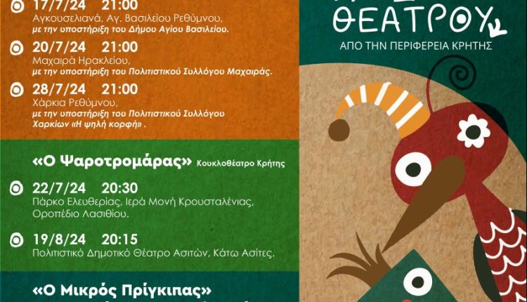 Συνεχίζονται οι «Ημέρες Παιδικού Θεάτρου» από την Περιφέρεια Κρήτης, με σειρά θεατρικών παραστάσεων, με δωρεάν είσοδο για μικρούς και μεγάλους. Μαθήτριες και μαθητές, εκπαιδευτικοί και γονείς θα έχουν την ευκαιρία να παρακολουθήσουν παραστάσεις ψυχαγωγίας, ευαισθητοποίησης και ενημέρωσης σχετικά με σημαντικά διαχρονικά ζητήματα.