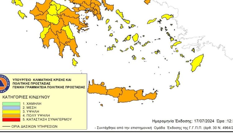 Η Πολιτική Προστασία Περιφέρειας Κρήτης ενημερώνει ότι, σύμφωνα με τον ημερήσιο Χάρτη Πρόβλεψης Κινδύνου Πυρκαγιάς της Γενικής Γραμματείας Πολιτικής Προστασίας για σήμερα Πέμπτη 18 Ιουλίου 2024 η κατηγορία Κινδύνου Πυρκαγιάς για όλη την Κρήτη, είναι κατηγορίας κινδύνου 4 (πολύ υψηλός).