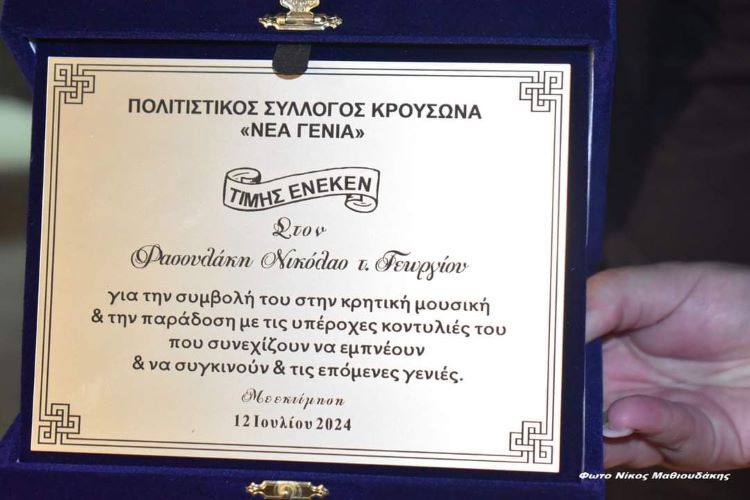 Με μαντολίνα τίμησε η «Νέα Γενιά» το λυράρη δάσκαλο Νίκο Φασουλάκη- Συγκινημένος ο γιος του Αλέκος παρέλαβε την τιμητική πλακέτα (Φωτογραφίες)
