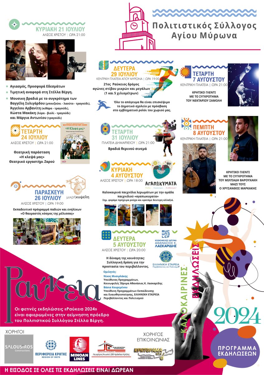 Τα “Ραύκεια 2024″ είναι εδώ και ξεκινούν στις 21 Ιουλίου με ένα ενδιαφέρον πρόγραμμα καλοκαιρινών εκδηλώσεων όπως σας έχουμε συνηθίσει χρόνια τώρα” αναφέρει ο πρόεδρος του Πολιτιστικού Συλλόγου Αγίου Μύρωνα Φανούρης Χανιωτάκης.
