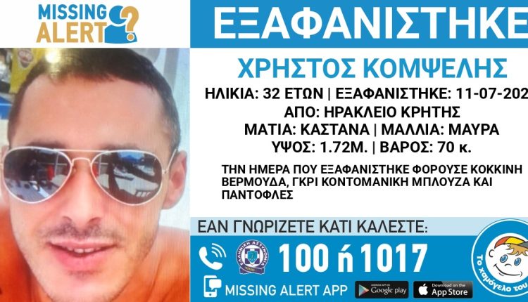 Στις 11 Ιουλίου 2024, απογευματινές ώρες, εξαφανίστηκε από την οικία του στο Ηράκλειο Κρήτης, ο Κομψέλης Χρήστος, 32 ετών. Το «Χαμόγελο του Παιδιού» ενημερώθηκε για την εξαφάνιση του σήμερα, 22/07/2024, και προχώρησε στη δημοσιοποίηση των στοιχείων του ενήλικα κατόπιν αιτήματος της οικογένειας του και ενημέρωσης της Εισαγγελίας, καθώς ενδέχεται να συντρέχουν λόγοι οι οποίοι θέτουν τη ζωή του σε κίνδυνο.
