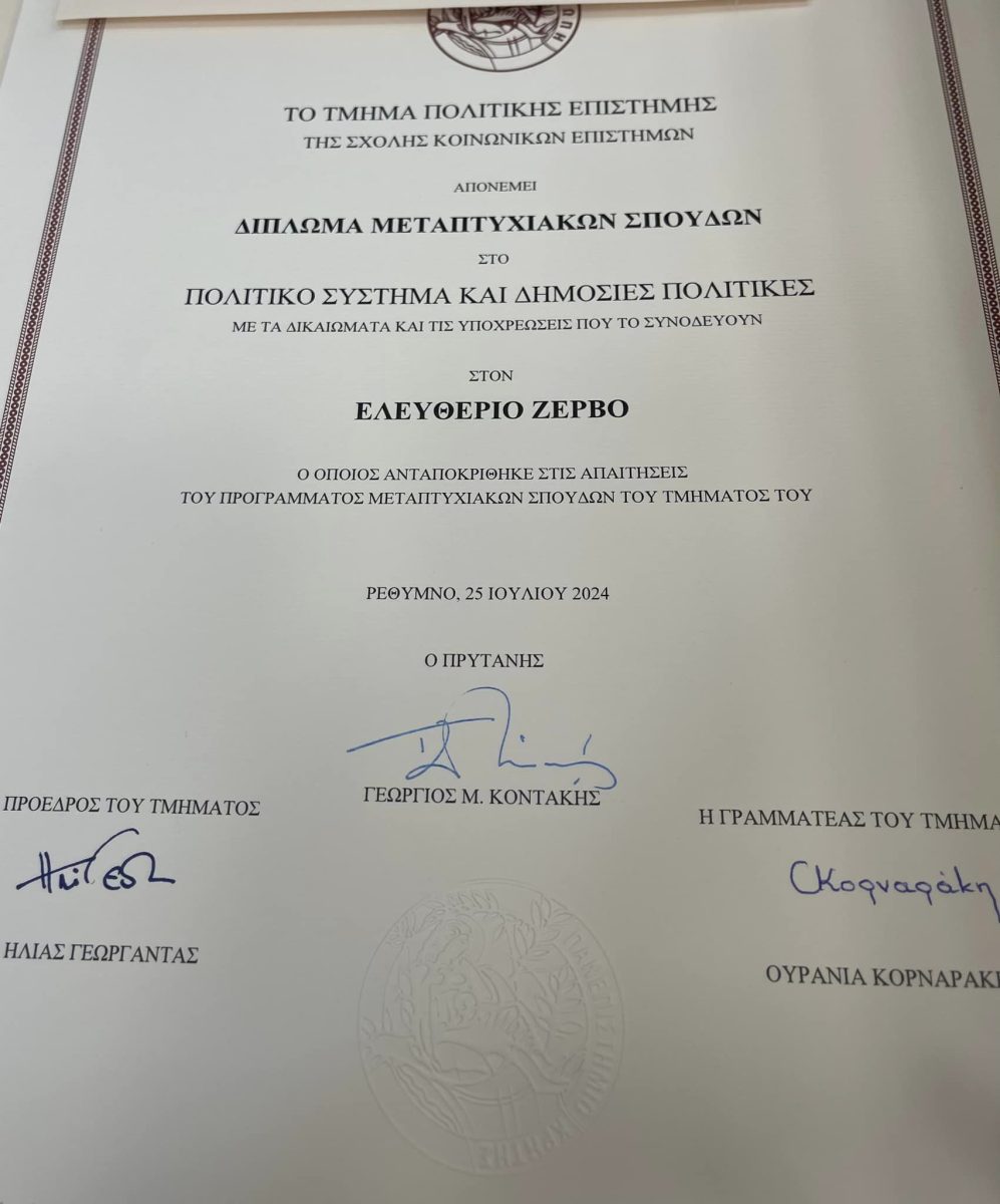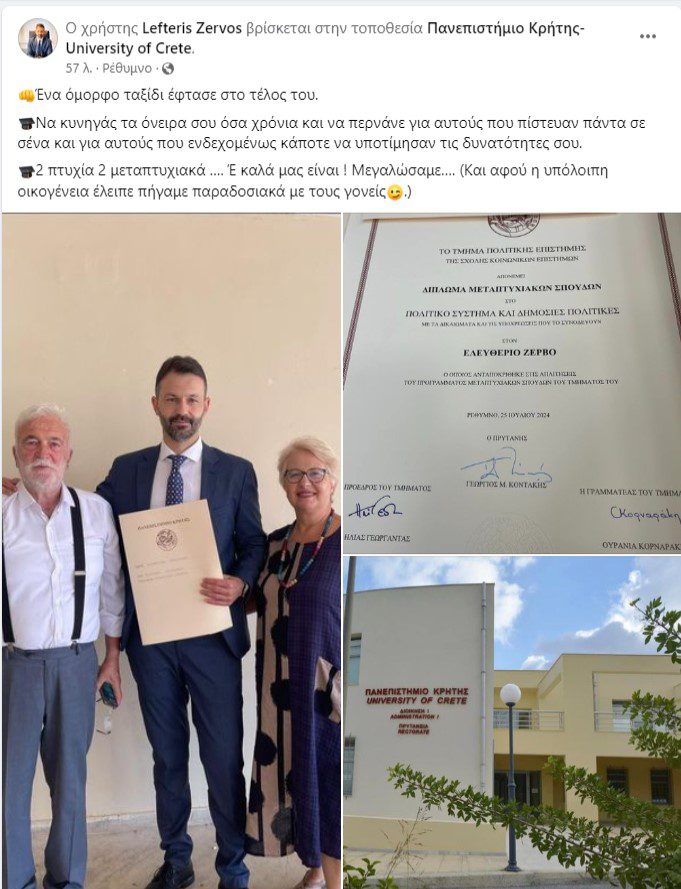 Με υπερηφάνεια ο Λευτέρης Ζερβός παρέλαβε από τον Πρύτανη του Πανεπιστημίου Κρήτης Γιώργο Κοντάκη το δεύτερο του μεταπτυχιακό τίτλο σπουδών στο “Πολιτικό Σύστημα και Δημόσιες Πολιτικές” από το τμήμα Πολιτικής Επιστήμης της Σχολής Κοινωνικών Επιστημών. Ο ίδιος με ανάρτηση του σε προσωπικό του προφίλ, κάνει λόγο για ένα όμορφο ταξίδι καθώς και για “τα όνειρα που πρέπει πάντα να κυνηγάς, ακόμη και αν κάποιοι υποτιμούν τις δυνατότητες σου”, όπως αναφέρει με νόημα.