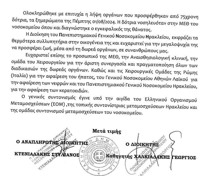 Με ανακοίνωσή του, το Πανεπιστημιακό Νοσοκομείο Ηρακλείου εκφράζει τα ειλικρινή συλλυπητήρια στην οικογένεια και τη ευχαριστεί για τη μεγαλοψυχία της.