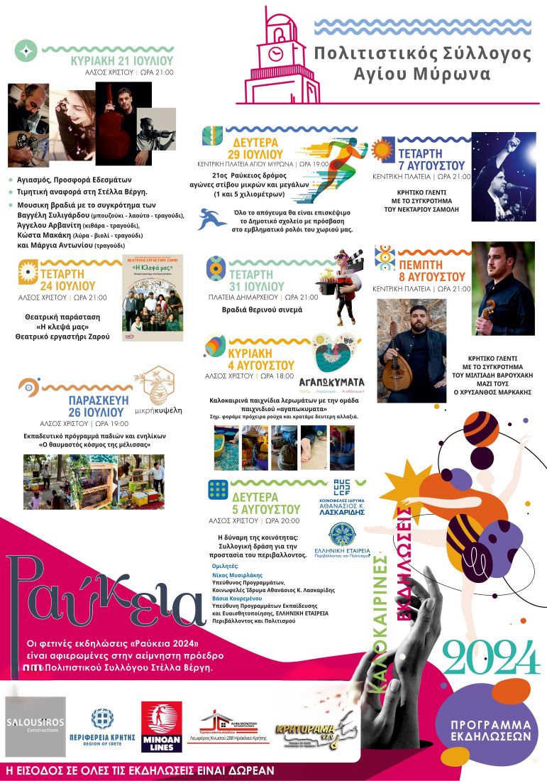 Σε εξέλιξη είναι οι πολιτιστικές εκδηλώσεις ΡΑΥΚΕΙΑ 2024 που διοργανώνει ο πολιτιστικός σύλλογος Αγ. Μύρωνα μέχρι τις 8 Αυγούστου εορτή του πολιούχου του χωριού. Οι εκδηλώσεις που ακολουθούν είναι: