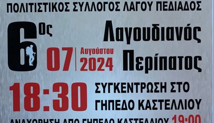 Στο πλαίσιο των Πολιτιστικών Εκδηλώσεων που διοργανώνει ο Πολιτιστικός Σύλλογος Λαγού Πεδιάδος για το 2024, συνδιοργανώνει με τη στήριξη της Περιφέρειας Κρήτης τον 6ο Λαγουδιανό Περίπατο.