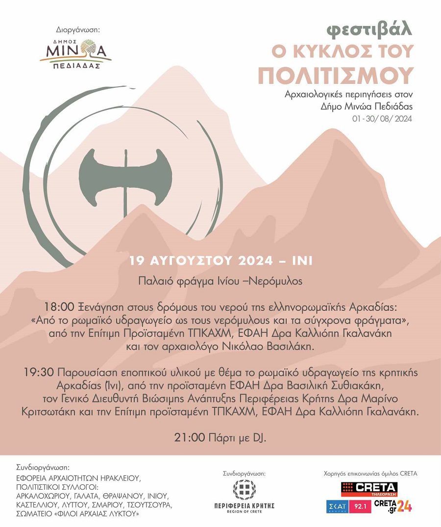 Συνεχίζεται το 1ο θεματικό Φεστιβάλ «Ο κύκλος του Πολιτισμού», με τίτλο: «Αρχαιολογικές περιηγήσεις στον Δήμο Μινώα Πεδιάδας». Επόμενος σταθμός του Φεστιβάλ, τη Δευτέρα 19 Αυγούστου, είναι το Ίνι με σημείο αναφοράς το παλαιό φράγμα Ινίου.