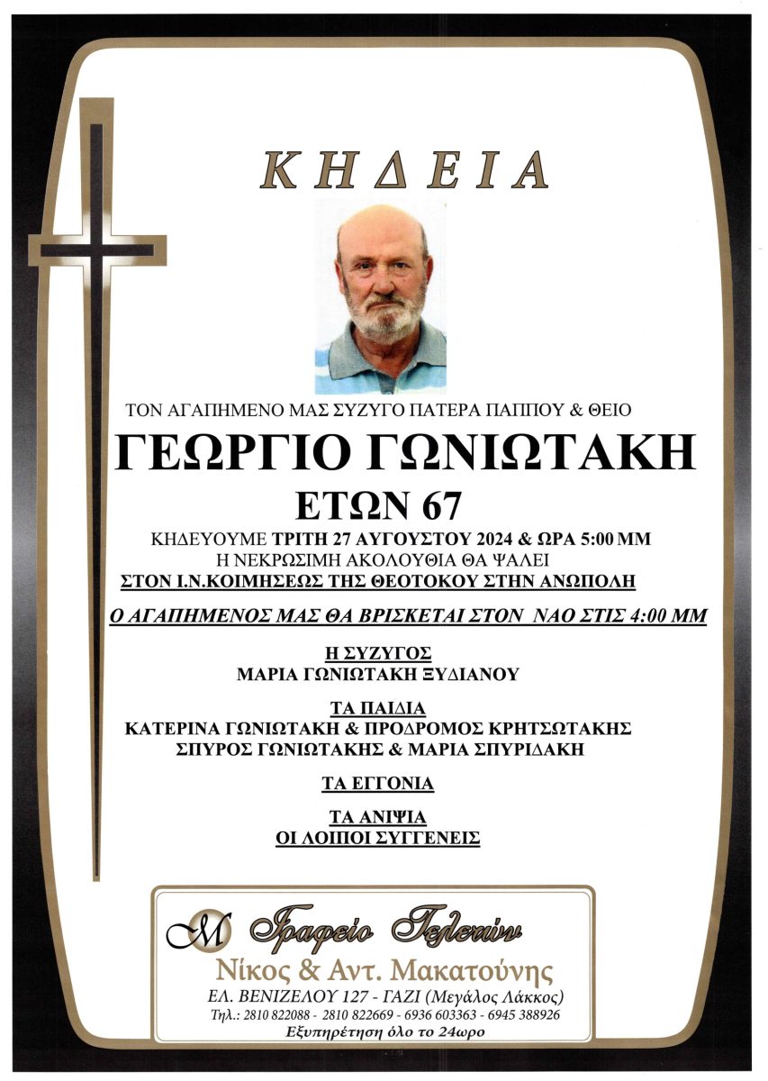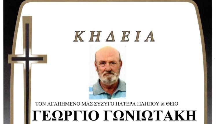 Την Τρίτη 27 Αυγούστου στις 5 το απόγευμα θα τελεστεί η κηδεία του Γεώργιου Γωνιωτάκη στον Ι.Ν. Κοιμήσεως της Θεοτόκου στην Ανώπολη.