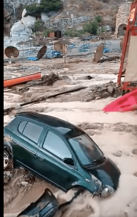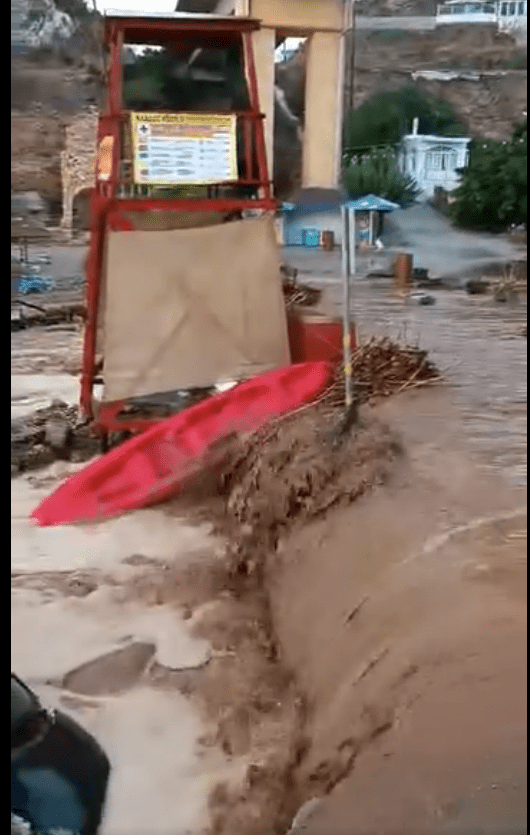 Φαίνονται οχήματα που έχουν παρασυρθεί, μηχανάκια, κάδοι απορριμμάτων ενώ χάθηκε και μέρος της παραλίας και μαζί της πήρε και τον εξοπλισμό.
