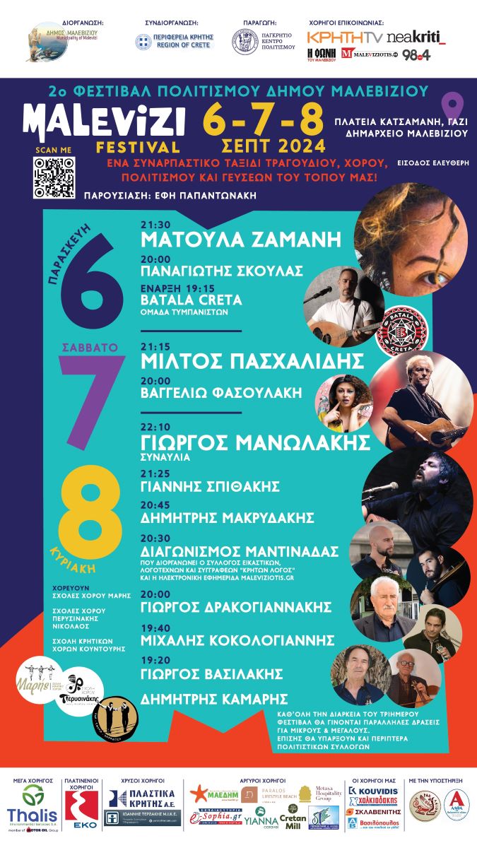 Το MALEVIZI FESTIVAL ήρθε για να μείνει και αυτό φάνηκε από τις χιλιάδες κόσμου που αγκάλιασαν την πρώτη προσπάθεια που έγινε τον Σεπτέμβριο του 2023. Φέτος ο πήχης μπαίνει ψηλά και ο στόχος του Δήμου Μαλεβιζίου είναι, το 2ο MALEVIZI FESTIVAL να αποτελέσει σημείο αναφοράς στα πολιτιστικά δρώμενα του νησιού.