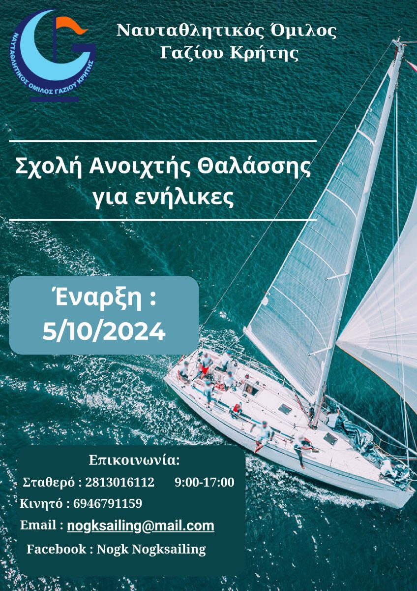 Ο Ναυταθλητικός Όμιλος Γαζίου Κρήτης Ν.Ο.Γ.Κ με πολυετή εμπειρία στην ιστιοπλοΐα και με βασικό στόχο την μετάδοση της ναυτοσύνης και του ναυταθλητισμού στην Κρήτη με χαρά ανακοινώνει την έναρξη της 32ης σχολής ιστιοπλοΐας ανοιχτής θάλασσας.