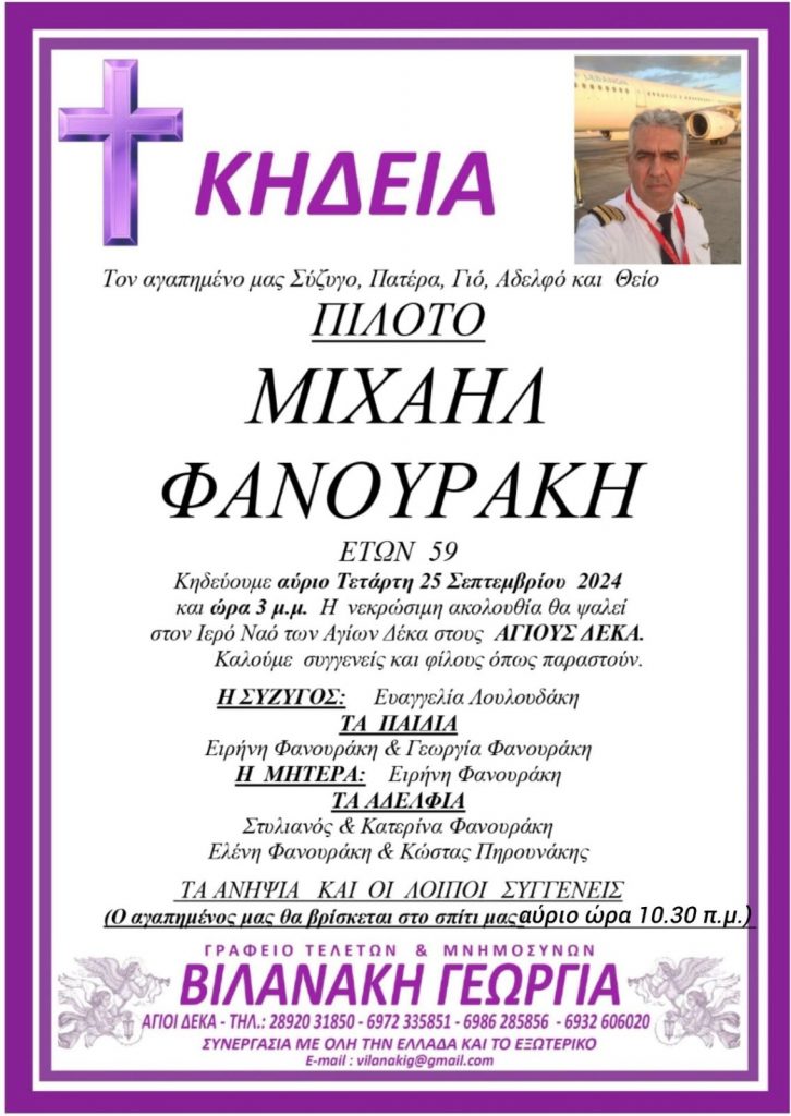 Η εξόδιος ακολουθία θα ψαλεί στις 3 το μεσημέρι στον Ιερό Ναό των Αγίων Δέκα στους Αγίους Δέκα. Η σορός του άτυχου Μιχάλη θα βρίσκεται στο σπίτι της οικογένειας από τις 10:30 το πρωί.