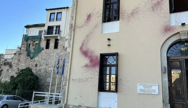 Συνθήματα και μπογιές στο κτήριο της Αποκεντρωμένης Διοίκησης στο Ηράκλειο