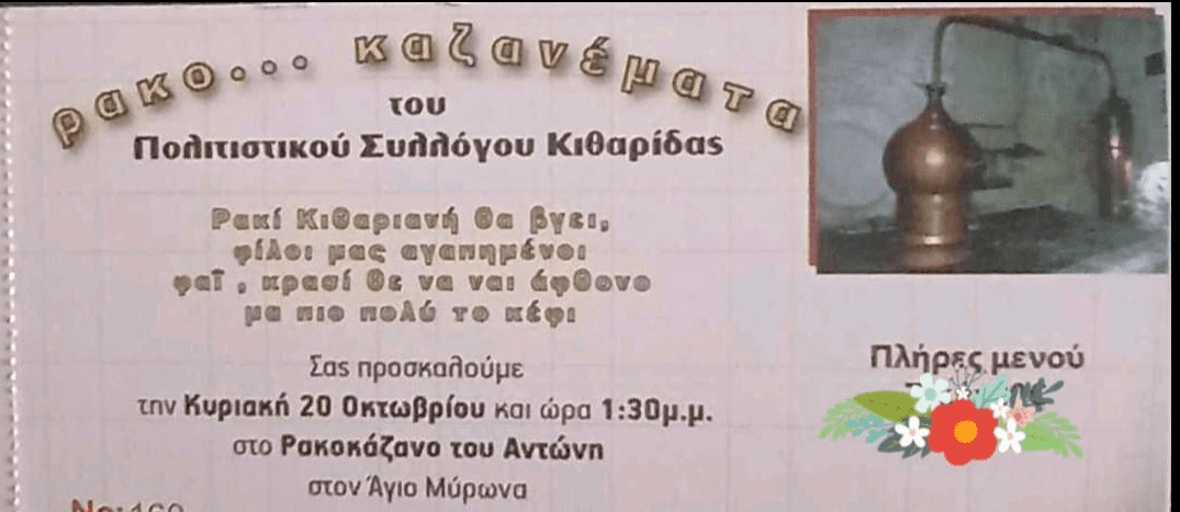Ο Πολιτιστικός Σύλλογος Κιθαρίδας που έχει πλέον ανακάμψει απευθύνει ανοιχτή πρόσκληση στους Κιθαριανούς και όχι μόνο να διασκεδάσουν όλοι μαζί παρέα! Το γλέντι θα στηθεί στο ρακοκάζανο του