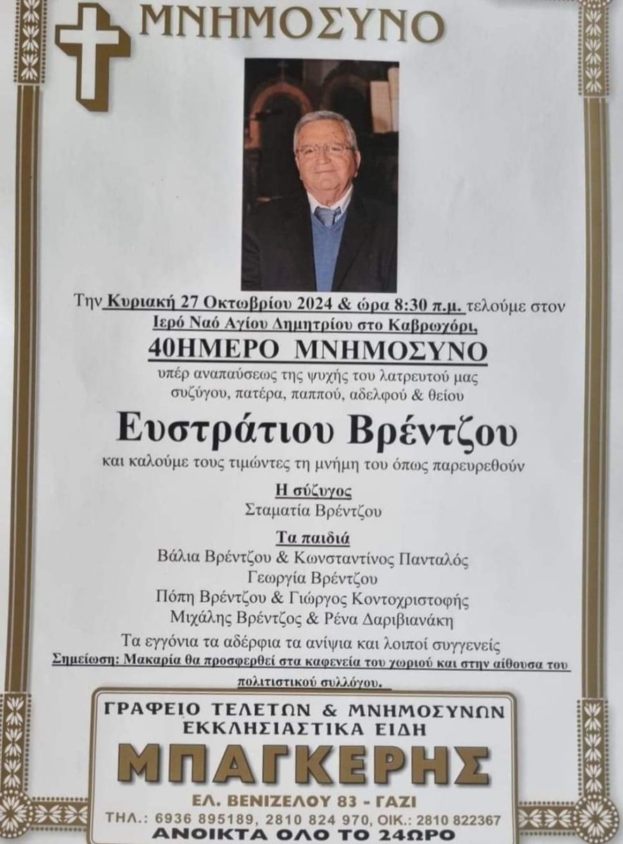 Την Κυριακή 27 Οκτωβρίου θα γίνει το 40ήμερο μνημόσυνο του Στρατή Βρέντζου στο Καβροχώρι, στον Ι.Ν. Αγίου Δημητρίου στις 8.30 μ.μ.
