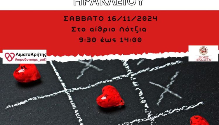 Το Σάββατο 16 Νοεμβρίου 2024 θα πραγματοποιηθεί εθελοντική αιμοδοσία στο κέντρο της πόλης του Ηρακλείου και συγκεκριμένα στο αίθριο της Λότζια από τις 09:30 έως τις 14:00.