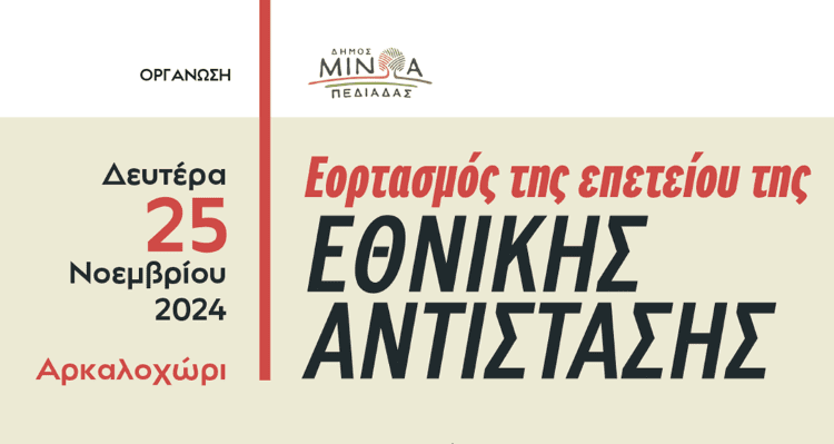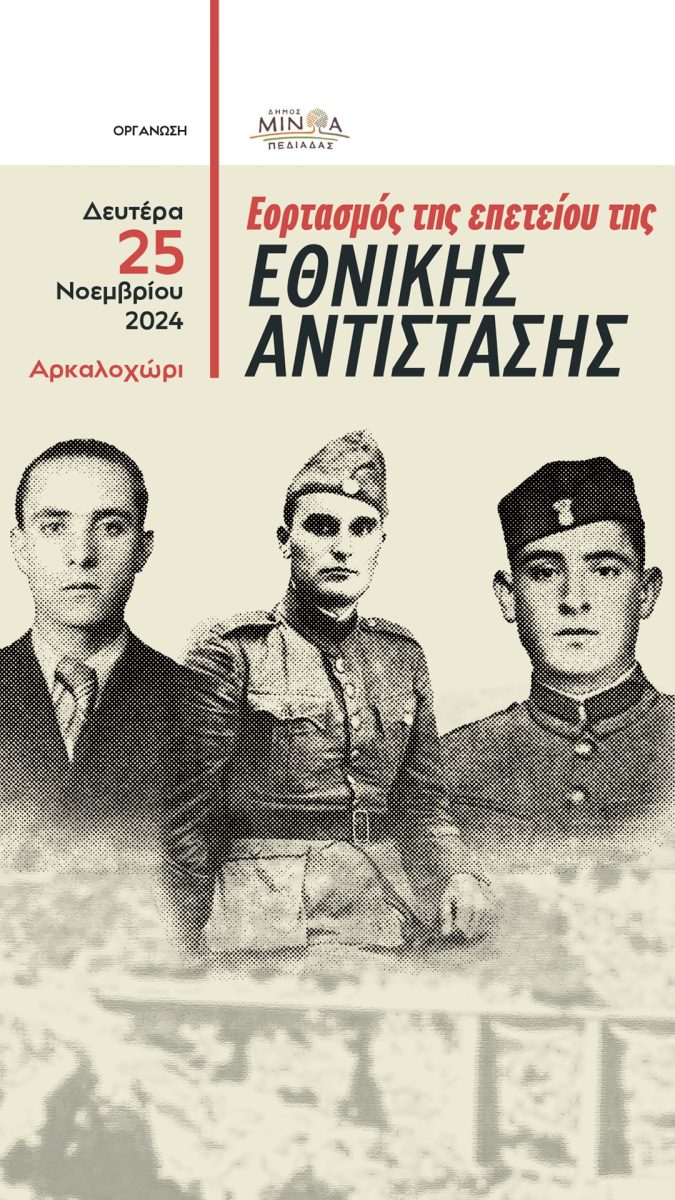 Ο Δήμος Μινωα Πεδιάδας τιμάει την Επέτειο της Εθνικής Αντίστασης με μία σημαντική εκδήλωση που θα πραγματοποιηθεί στο Πολιτιστικό Πολύκεντρο Ιεράς Μητροπόλεως Αρκαλοχωρίου, Καστελλίου και Βιάννου στο Αρκαλοχώρι, τη Δευτέρα 25 Νοεμβρίου. Θα προηγηθεί επιμνημόσυνη δέηση και κατάθεση στεφάνων στα μνημεία των Ηρώων.