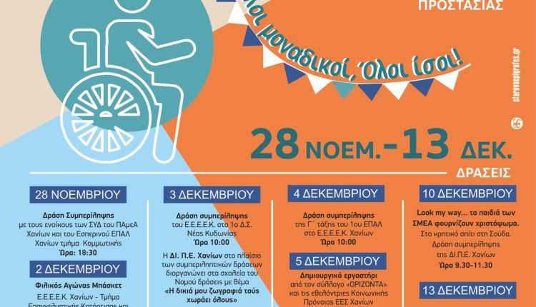 Mε αφορμή την 3η Δεκεμβρίου, η οποία είναι αφιερωμένη στα Άτομα με Αναπηρία, η Διεύθυνση Κοινωνικής Προστασίας του Δήμου Χανίων διοργανώνει σειρά δράσεων από τις 28 Νοεμβρίου έως τις 13 Δεκεμβρίου 2024, σε συνεργασία με το Γραφείο Φυσικής Αγωγής της Δευτεροβάθμιας Εκπαίδευσης Χανίων, την Πρωτοβάθμια Εκπαίδευση Χανίων, Συλλόγους και Σωματεία ΑμεΑ, που δραστηριοποιούνται στον Δήμο.