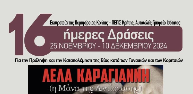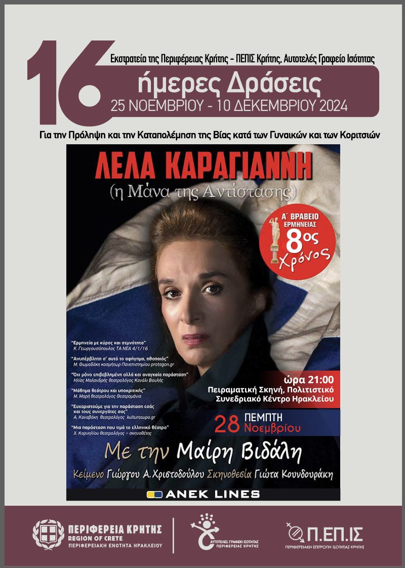 Στο πλαίσιο των «16ήμερων Δράσεων της Περιφέρειας Κρήτης για την Πρόληψη και την Καταπολέμηση της Βίας κατά των Γυναικών και των Κοριτσιών» παρουσιάζεται η θεατρική παράσταση-Μονόλογος του Γιώργου Α. Χριστοδούλου «ΛΕΛΑ ΚΑΡΑΓΙΑΝΝΗ η Μάνα της Αντίστασης», με τη Μαίρη Βιδάλη από το Διάχρονο Θέατρο, αύριο Πέμπτη, 28 Νοεμβρίου 2024 και ώρα 9:00μ.μ., στην Πειραματική Σκηνή του Πολιτιστικού Συνεδριακού Κέντρου Ηρακλείου», με ελεύθερη είσοδο για τους πολίτες.