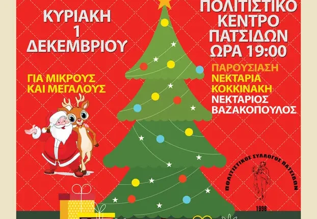 Ο Πολιτιστικός Σύλλογος Πατσίδων σας προσκαλεί στην έναρξη των Χριστουγεννιάτικων εκδηλώσεων στις Πατσίδες! Την Κυριακή 1 Δεκεμβρίου στις 19.00 η Φωταγώγηση του Χριστουγεννιάτικου Δέντρου στο Πολιτιστικό Κέντρο Πατσίδων! Υποδεχόμαστε από τις 18.30 τον Άγιο Βασίλη με το έλκηθρο και τα Ξωτικά του,τους Ήρωες της Ντίσνευ, τον Όλαφ τον χιονάνθρωπο από την Frozen , την Χριστουγεννιάτικη Μίνι με τον Μίκυ, την Μλούι το κουτάβι, το Ξωτικό των Χριστουγέννων και την γλυκιά Αγιοβασιλίνα για να γράψουν μαζί με τα παιδιά γράμματα στον Άγιο Βασίλη μας!