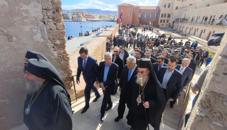 Ακολούθησε πομπή έως το Φρούριο Φιρκά όπου μετά την ομιλία του Δημάρχου Χανίων Παναγιώτη Σημανδηράκη έγινε η έπαρση της σημαίας από τον Υπουργό Επικρατείας Μάκη Βορίδη, τον Περιφερειάρχη Κρήτης Σταύρο Αρναουτάκη, τον Αντιπεριφερειάρχη Χανίων Νίκο Καλογερή, τον Δήμαρχο Χανίων Παναγιώτη Σημανδηράκη και τον Γενικό Διευθυντή του του Εθνικού Ιδρύματος Ερευνών και Μελετών «Ελευθέριος Κ. Βενιζέλος» Νίκο Παπαδάκη. Ακολούθησε ξενάγηση στους χώρους του Ναυτικού Μουσείου Κρήτης.