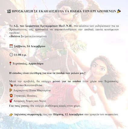 Το Δ.Σ. του Σωματείου Εργαζομένων Πα.Γ.Ν.Η., στο πλαίσιο των εκδηλώσεων για τα Χριστούγεννα, σας προσκαλεί να παρακολουθήσετε την παιδική ταινία κινούμενων σχεδίων: