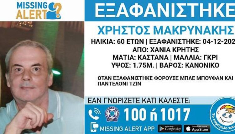 Αίσιο τέλος είχε η εξαφάνιση του 60χρονου Χρήστου Μακρυνάκη από τα Χανιά τα ίχνη του οποίου είχαν χαθεί πριν λίγες ημέρες και μάλιστα είχε εκδοθεί Missing Alert .Σύμφωνα με ανακοίνωση του “Χαμόγελου του Παιδιού”, o 60χρονος εντοπίστηκε στην περιοχή του Αλικιανού και είναι καλά στην υγεία του ενώ τονίζεται ότι η οργάνωση θα βρίσκεται κοντά στον Χρήστο και στην οικογένειά του για οτιδήποτε χρειαστεί.